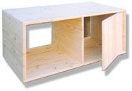 In legno grezzo di abete, levigato, non verniciato e non trattato, viene fornito già montato, completo di quattro ruote. Vano con sportelli su fronte e retro per riporre videoregistratore e videocassette. Dimensioni (Profondità x Lunghezza x Altezza) 48 x 96 x 49 cm