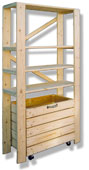 In legno grezzo di abete, levigato, non verniciato e non trattato, traspirante, il carrello porta conserve (o biancheria) completo di ruote e manici viene fornito già montato, a richiesta, per accessoriare lo scaffale, nel quale si integra sotto i ripiani.